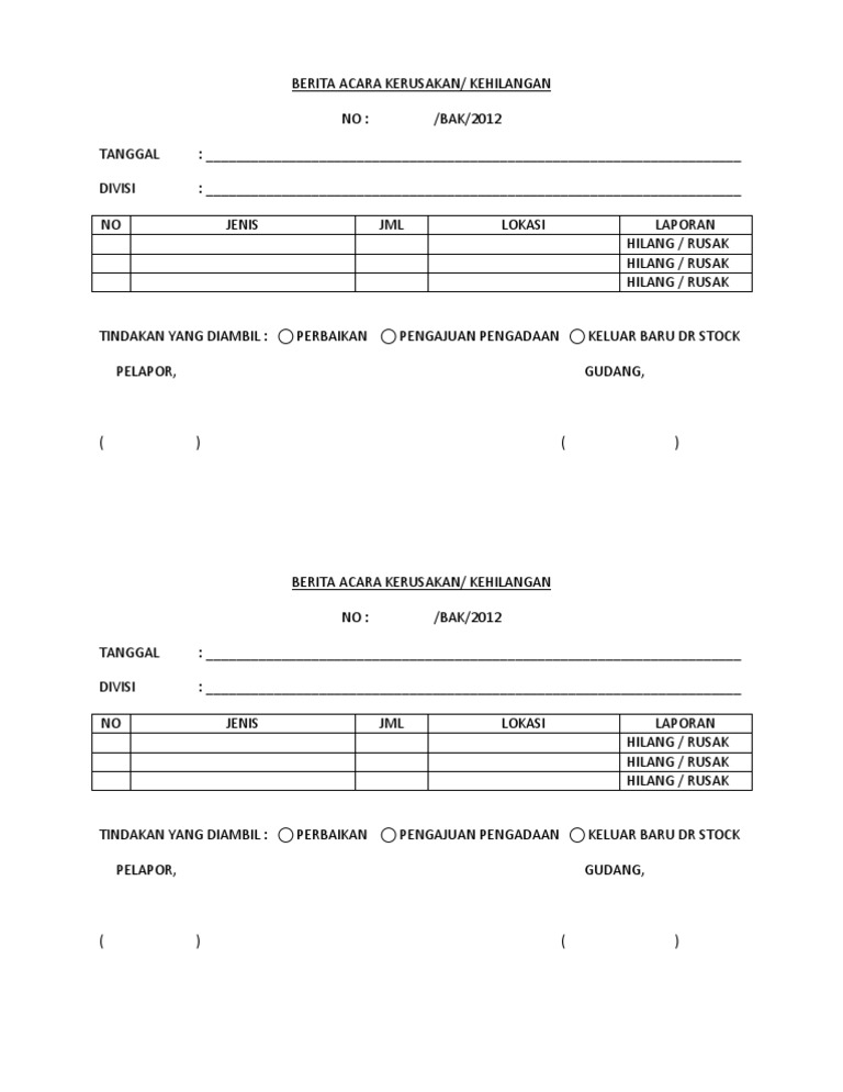 Berita Acara Perbaikan Alat Doc Document from cdn.cupdf.com Check spelling or type a new query. Maybe you would like to learn more about one of these? Contoh surat berita acara kerusakan barang. We did not find results for: